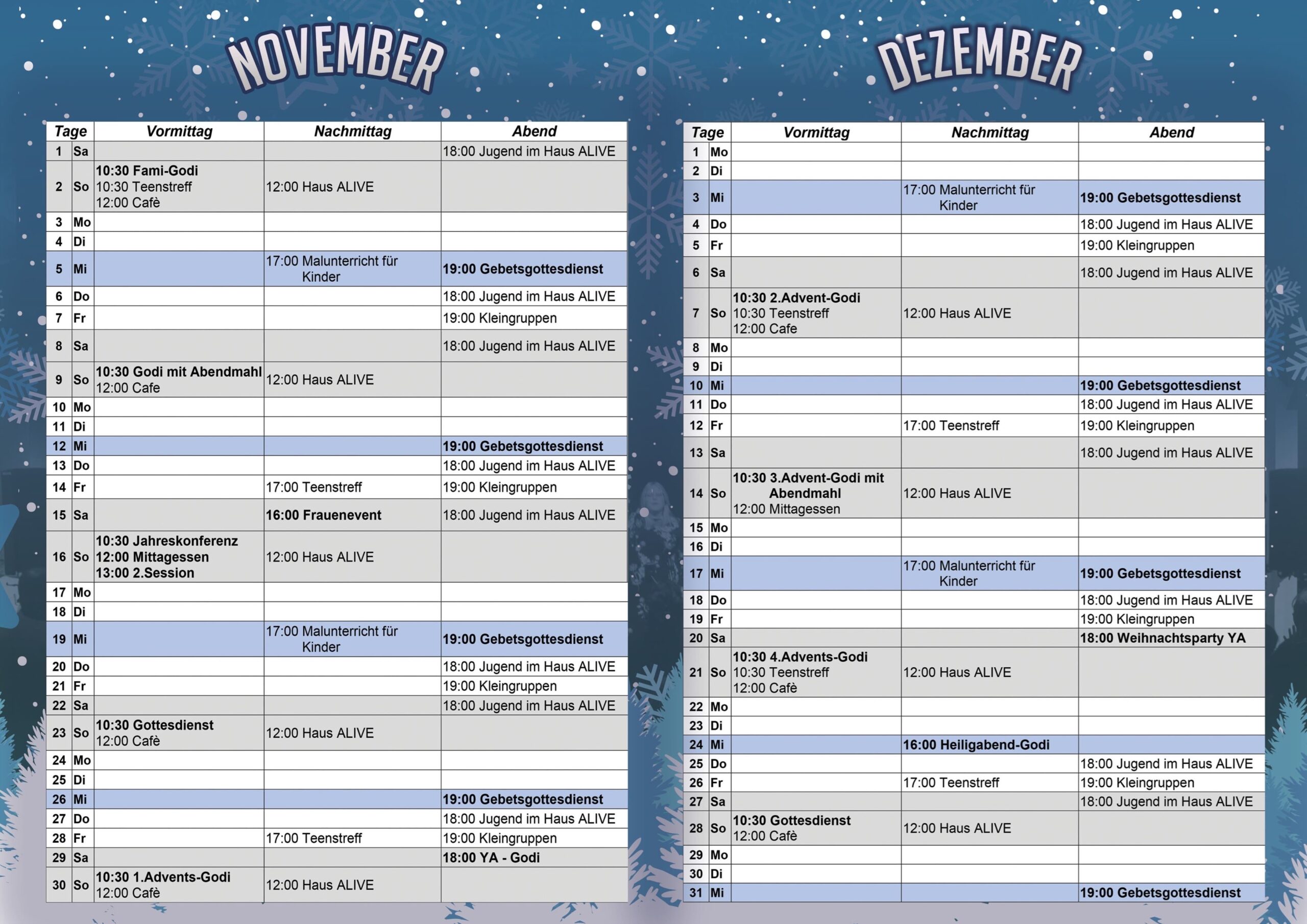 Hier findest du den Dienst- und Veranstaltungsplan für November und Dezember. Er enthält alle Zusammenkünfte, Treffen und Veranstaltungen, sodass du deine Zeit im Voraus gut planen kannst und nichts Wichtiges verpasst.